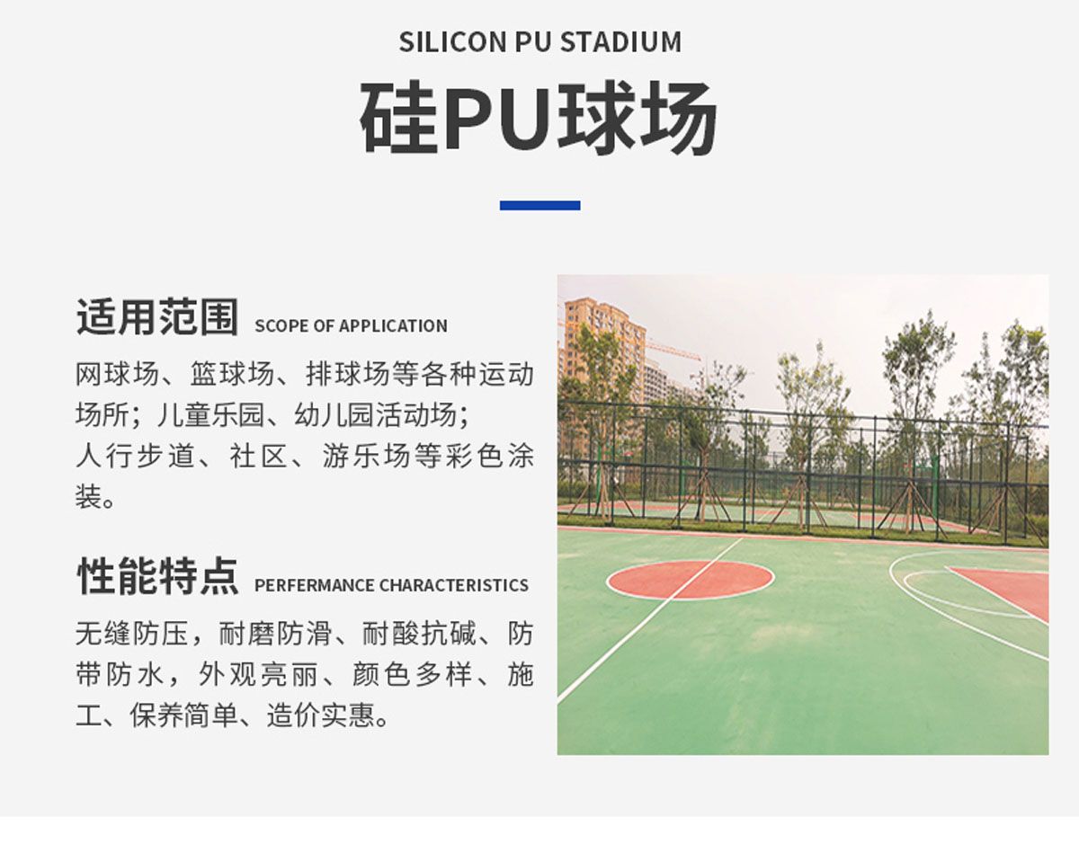 “贏方”無溶劑硅PU是我公司根據新國標要求,利用新的生產技術和產品配方體系研發而成。相比傳統材料,該產品在環保、耐候各方面都有了很大的提高。通過對彈性層結構的不用設計,可以分為多種系列產品,豐富了產品類型。該產品具有很強的適應性,可滿足各類場地、各種氣候條件的適用,是一種高品質產品。